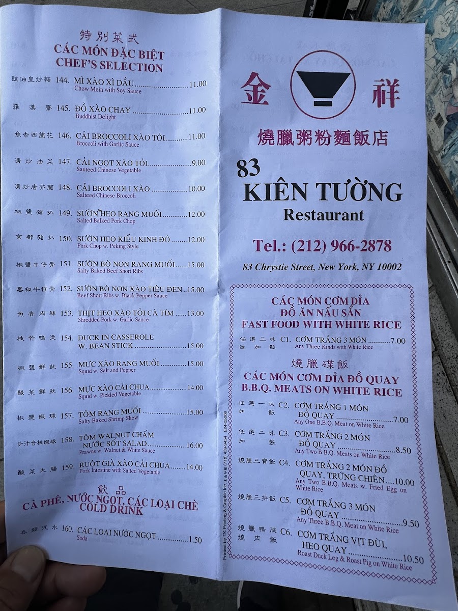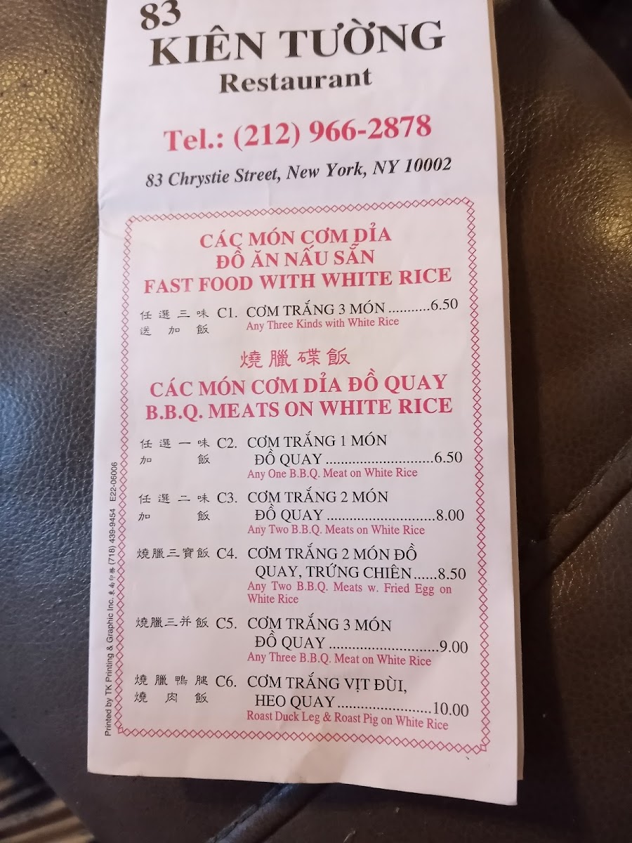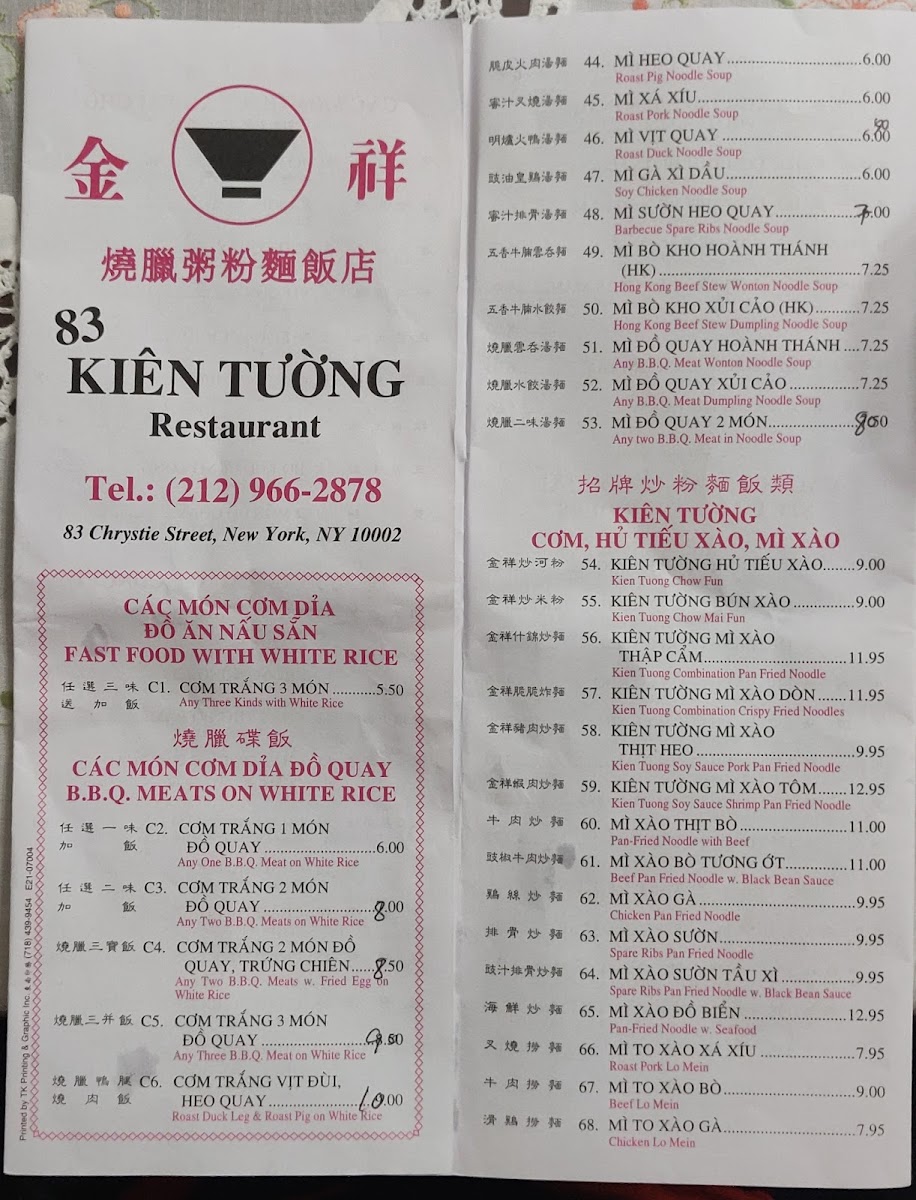 Tucked along Chrystie Street in Manhattan’s Chinatown, the New Kim Tuong Menu brings together familiar comfort and bold flavor in one satisfying lineup. It’s the kind of spot where sizzling plates, aromatic broths, and wok-tossed noodles make the whole place smell like home. From crispy roast duck to tender beef chow fun, every dish feels crafted for flavor first, not fuss. The portions are generous, the seasoning balanced, and the textures-especially in the seafood and stir-fry dishes-keep things lively from start to finish. Whether you’re in for a quick lunch or a late-night craving, the menu covers it all, with rice platters, noodle soups, and a few sweet surprises to finish things off. It’s a place that leans on honest cooking and steady hands, serving the kind of Cantonese comfort food that keeps people coming back.